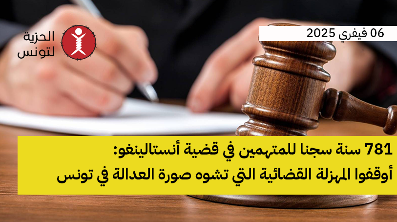 (تونس، 6 فيفري – فبراير 2025) يدين “ مرصد الحرية لتونس “ بشدة الأحكام القضائية الجائرة الصادرة في حق في ما يُعرف بقضية “أنستالينغو”، والتي تمثل انتهاكًا صارخًا لمبادئ العدالة وحقوق الإنسان حيث بلغ مجموع الأحكام 781 سنة. لقد أصدرت الدائرة الجنائية الثانية بالمحكمة الابتدائية بتونس، يوم الاربعاء 5 فيفري (فبراير) 2025، أحكامًا بالسجن تتراوح بين 5 و54 سنة، بالإضافة إلى غرامات مالية ومصادرة أملاك، ضد 41 متهمًا، بينهم شخصيات سياسية وإعلامية بارزة. يُعرب المرصد عن قلقه العميق إزاء التجاوزات الخطيرة التي شابت هذه القضية، والتي أشار إليها بيان الشركة الصادر في نفس اليوم. من بين هذه الخروقات: